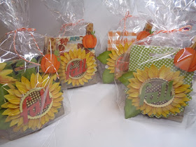The gold rick rack was die cut using a trim die at IO Stamps, again by Anna Wight, and I cut that out of gold poster board from the Dollar Tree. The pumpkins were die cut out of scraps using the Stitched Pumpkins die set from Lawn Fawn. The large tag shape the turkey is on is a die from a multi tags die set from Little B. Burlap flowers were on clearance at HobLob last year. "Let's Get Stuffed" is from a new stamp set at IO Stamps. Used a sign die set to cut that out so the turkey could be holding the sign. The "Give Thanks" is from a kit from Waffle Flower and I used scrap card stocks for that and put clear packing tape over the scrap card stock and then cut out the words - easy way to add shine to the letters. Inside the bags: