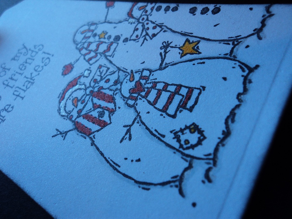 I used the small snowman face stamp from www.http://morningstarstamps.com and stamped at on the tag near the bottom using StazOn black ink. Used an orange marker to colour his nose: