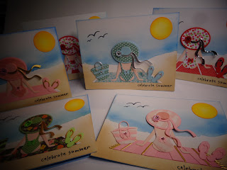 I also used a small bow punch to add a bow to the beach bag front and the back of the swim suit. For the sun I used a circle punch and sponged the edges of that with yellow ink and then an orange ink. Used a small flower punch for the flower on the hat and added gems from the stash to the hat flower as well as the bow on the bathing suit and beach bag. Fun cards to make and good use of stamps in my stash as well as scrap card stocks.